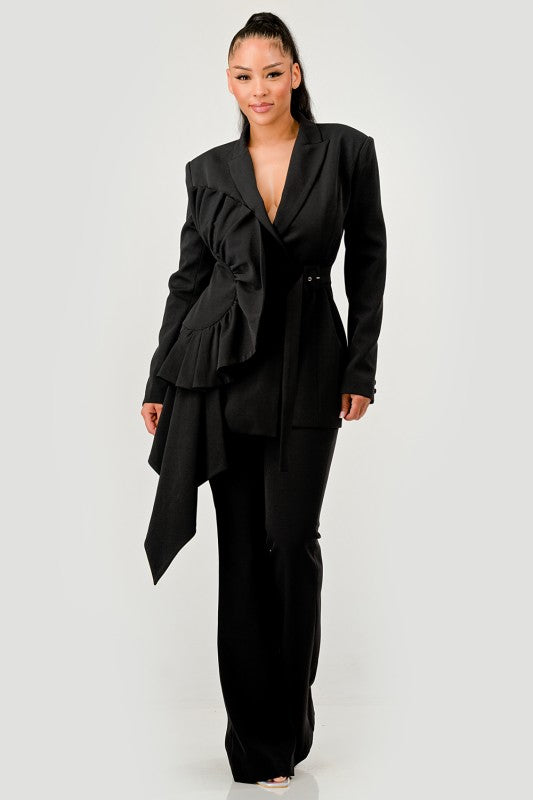 - Asymmetrical ruched detail and cascading ruffle on blazer